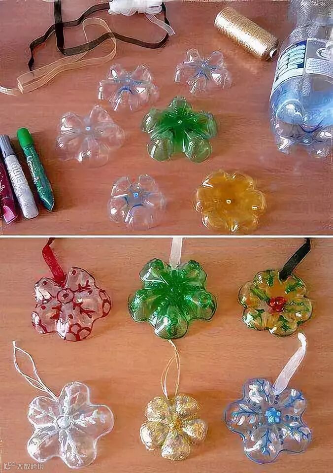 材料准备:塑料饮料瓶、彩色笔或者颜料、丝带、金粉等。