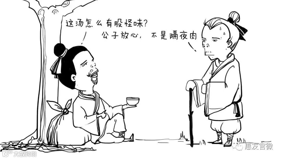 它说的是春秋时期,晋文公重耳流亡国外,饥肠辘辘,即将一命呜呼的时刻,一位叫介子推的同学从自己的大腿上割了一块肉,煮了一碗肉汤给公子喝。