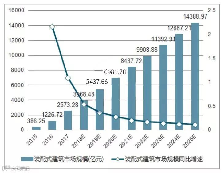 2015-2025年中国装配式建筑市场规模及同比增速测算(亿元、%)