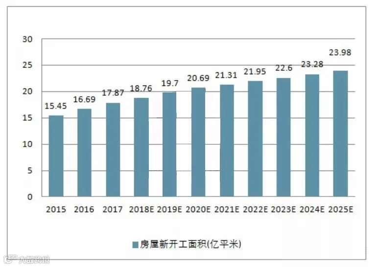 2015-2025年中国房屋新开工面积测算(亿平米)