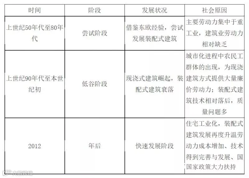 我国对装配式建筑的尝试始于20世纪50年代,一直到80年代,各种预制屋面梁、吊车梁、预制屋面板、预制空心楼板以及大板建筑等得到多次应用。 但由于当时我国预制装配式建筑技术比较落后,建筑工业化整体水平较低, 所以相应的装配式建筑质量偏低, 比如楼屋面板的密封效果不好,防水措施不完善,以致存在漏水、隔声效果差等问题,因此期间装配式建筑没有得到较大程度的发展。 进入90年代后,预制装配式建筑自身在设计水平、构件制作的精细程度和装配技术方面比较落后, 与之相比当时现浇混凝土技术迅速发展, 因而装配式建筑陷入低谷。 与发达国家相比,目前我国装配式建筑仍处于发展阶段,部分地区甚至徘徊在起步阶段。 近十年来,随着经济的快速发展,劳动力成本的上升, 预制构件加工精度与质量、装配式建筑施工技术和管理水平的提高以及国家政策因素的推动, 预制装配式建筑重新升温,并呈现快速发展的态势。