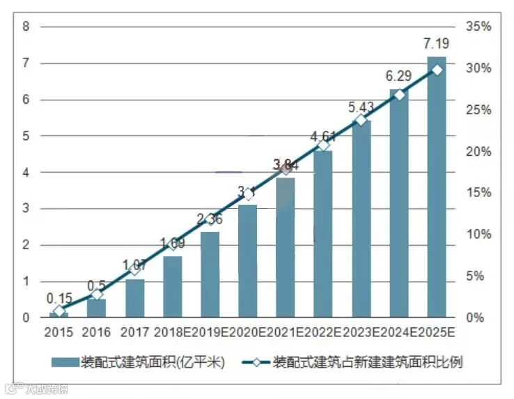 2015-2025年中国装配式建筑面积及装配式建筑占新建建筑面积比例测算(亿平米、%)