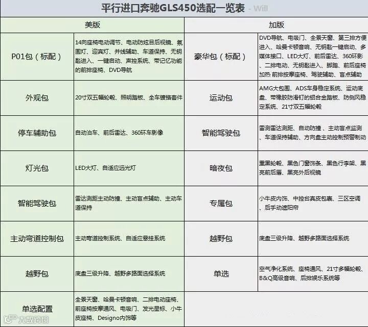 内饰方面的做工和细节设计方面,两个版本的车型几乎没有太大的差别,差异主要体现在舒适与高科技配置方面。加版奔驰GLS450配置起步就比美规版要高。加版标配豪华包,美规标配是:P01包、19寸轮毂、小窗、真皮座椅带加热、八项电动座椅调节等。具体请看下表-具体罗列了两个版本的选配包及所含配置。
