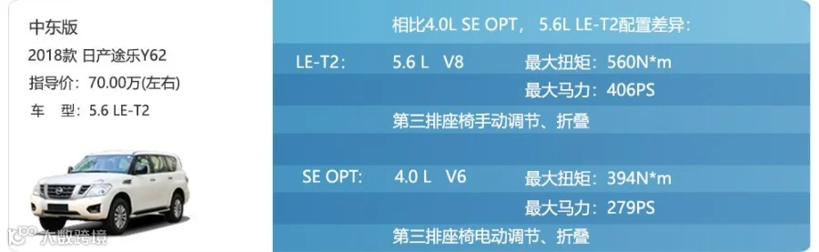 在配置方面,除了发动机不同,5.6L的LE-T2几乎与4.0L的SE-OPT版本大体相同,只不过5.6L车型把第三排座椅电动调节改成了手动,并缺少了电尾门。另外,途乐还有一款NISOM运动套件版本,这款车型在海外采用的是5. 6 L发动机,进入国内市场后,不少经销商选择了用4.0L车型后期改装,门槛较低。