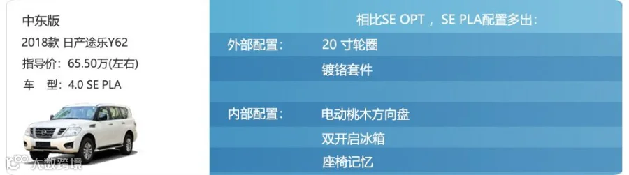 PLA是英文PLATINUM的缩写,和中规的铂金版是同一款车,但中东版65.50万元的市场参考价格要比中规的68.90万元低了不少,配置上相比OPT增加了20英寸轮圈、镀铬套件、电动方向盘和双开启冰箱等更加豪华的物件。