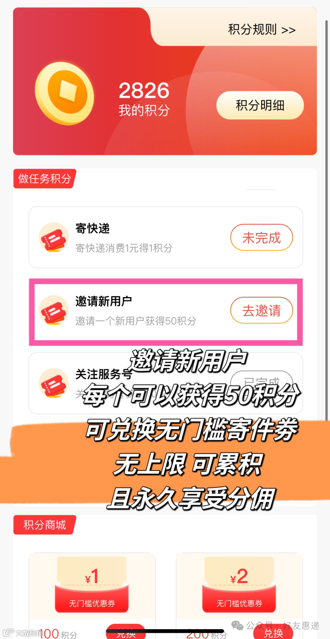 邀请得积分:每邀请1位好友,立赚50积分(折合0.5元)。