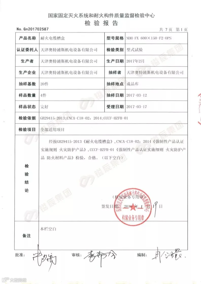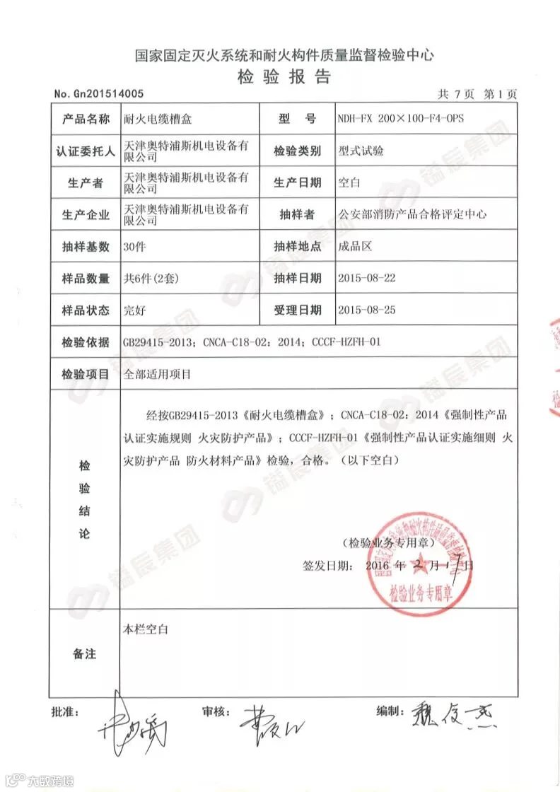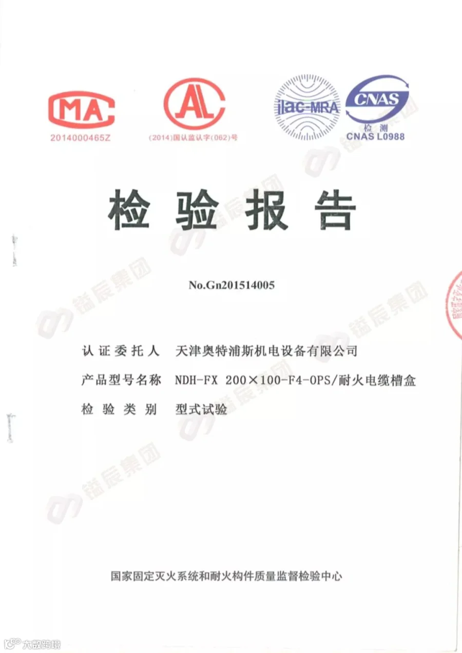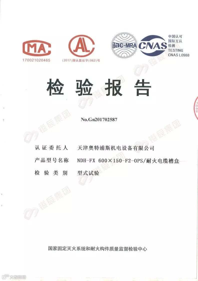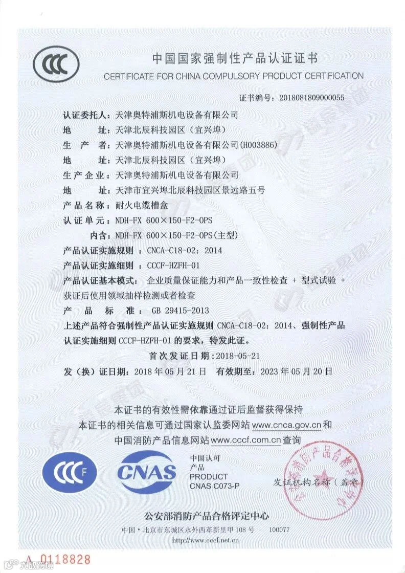 2014年8月公安部消防产品合格评定中心颁布的“关于强制性检验制度向CCC认证过渡工作要求中规定”,即2014年9月1日起,凡属于强制认证类的产品,均需取得CCC证书才可售卖,耐火电缆槽盒属火灾防护类产品一种,也是桥架产品的其中一种形式,我公司于2016年3月首次取得耐火电缆槽盒(NDH-FX 200X100-F4-OPS规格)产品认证证书 ,在华北地区为获此认证的企业,基于市场需求,我公司于2018年5月再取得增项规格即(NDH-FX 600X150-F2-OPS),将耐火等级提高至F2级,耐火性能可达到60分钟,下面简单给大家介绍一下我们的产品。
