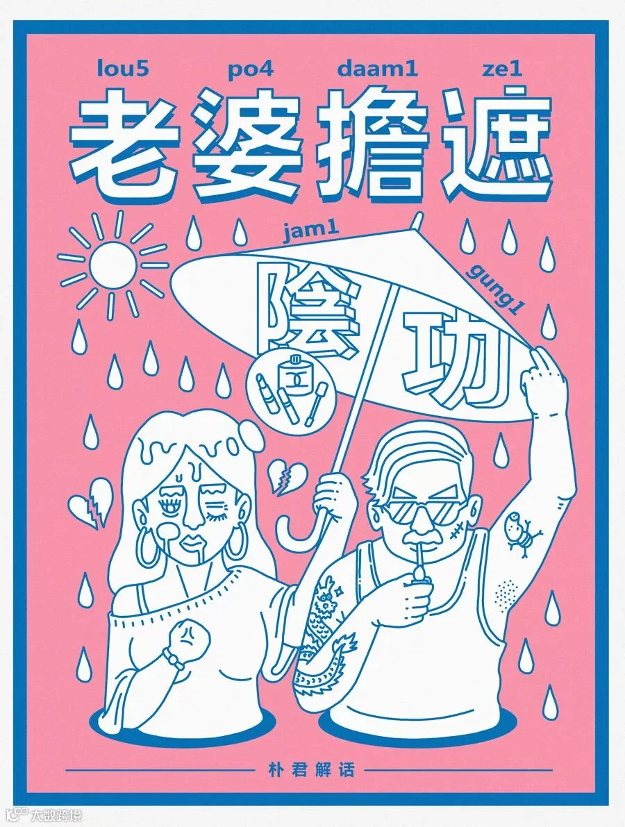 老婆为老公撑伞遮太阳,老公自然就阴凉了。粤语中 “担遮” 则为 撑伞,“公” 与 “功” 同音,所以“老婆担遮”即是“阴功”;“阴功”在粤语中,就是形容 凄惨可怜 的意思,详见图中女子。
