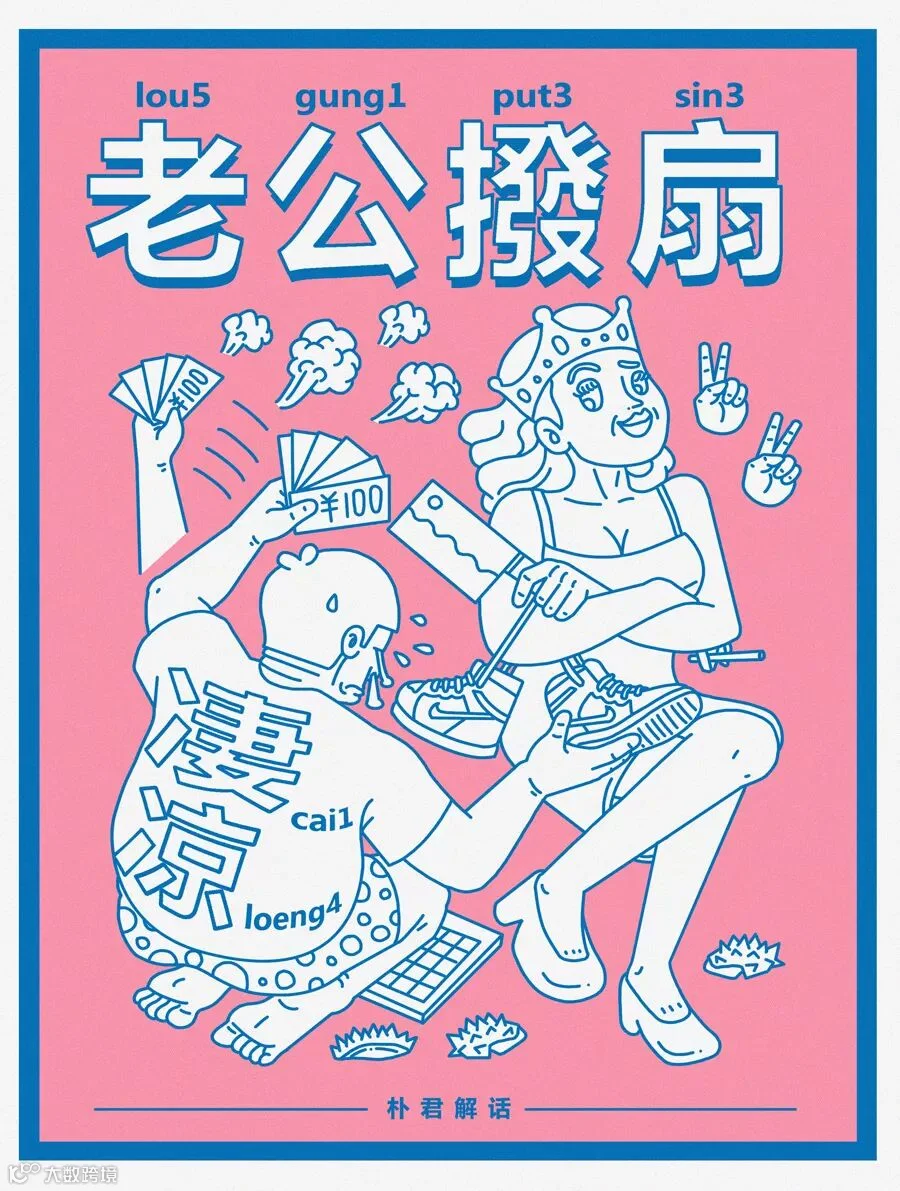 老公给妻子扇扇子,妻子感到凉快。粤语中,扇扇子即为 “拨扇” ,而 "妻” 与 “凄” 同音。所以“老公拨扇,凄凉”,指的就是悲凉痛苦,详见图中男子。