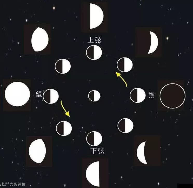 月相变化的周期是一个朔望月,月球围着地球公转一圈,产生一轮阴晴圆缺。当月亮在轨道上绕行到太阳和地球之间,月亮的阴暗的一面对着地球,这时叫朔,正是阴历每月的初一;当月亮绕绕行至地球的后面,被太阳照亮的半球对着地球,这时叫望,一般在阴历每月十五或十六。