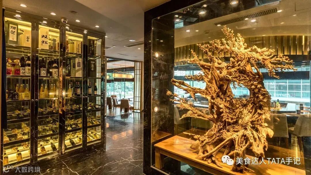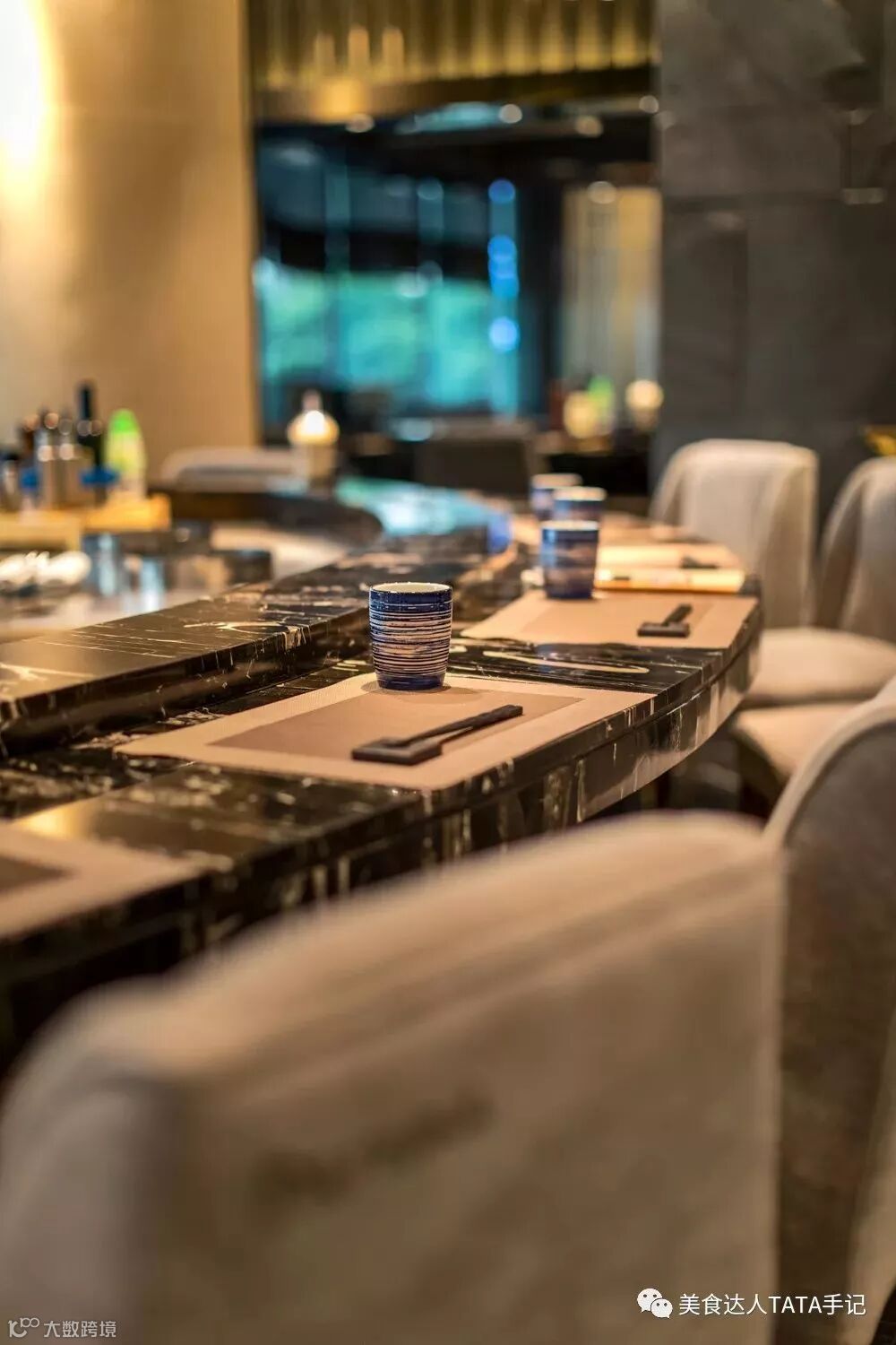 走过一整面墙的玻璃酒柜,正对透明落地窗的是240度环绕的大理石铁板烧台,气度非凡!