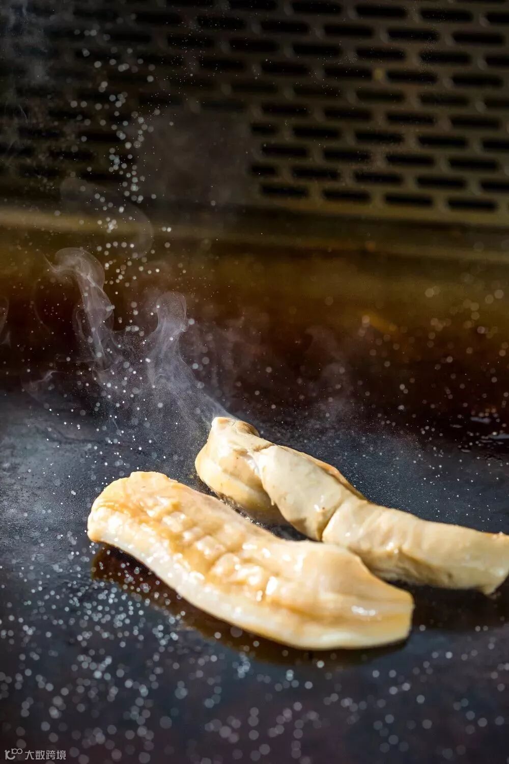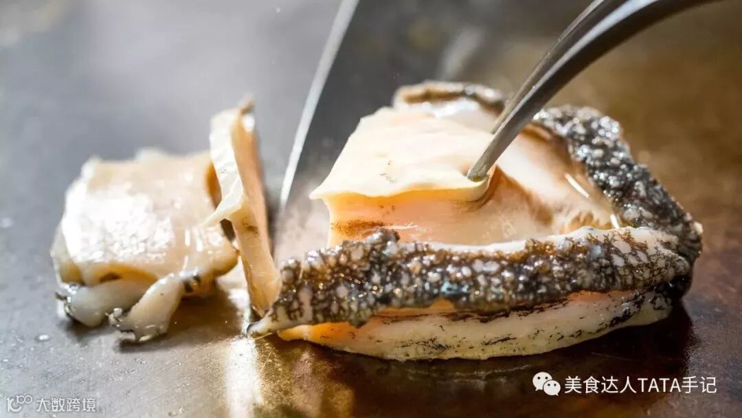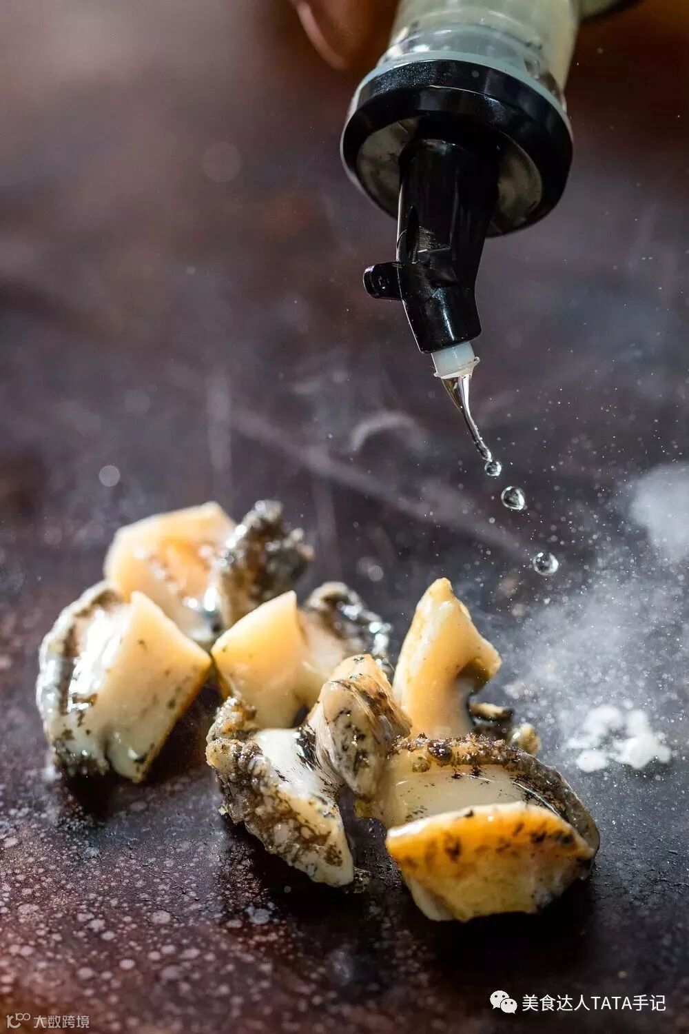 只见它被利落地铲出壳外,鲍鱼在铁板的热力催鼓下慢慢蠕动,撒上盐和胡椒粉,准备开吃。