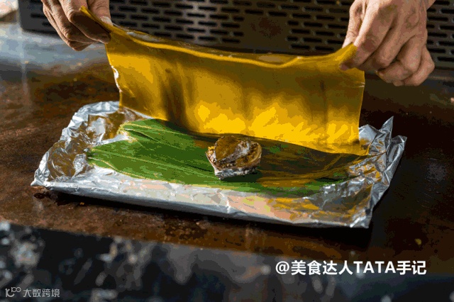 鲍鱼先用海带包住、铺上雪白的盐巴,盖上盖子用盐焗两分钟,再上铁板慢慢两面煎。