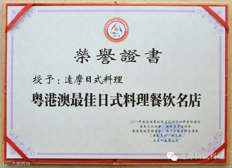 达摩日式料理获邀参加本次活动,并荣获“粤港澳最佳日式料理餐饮名店”奖项。