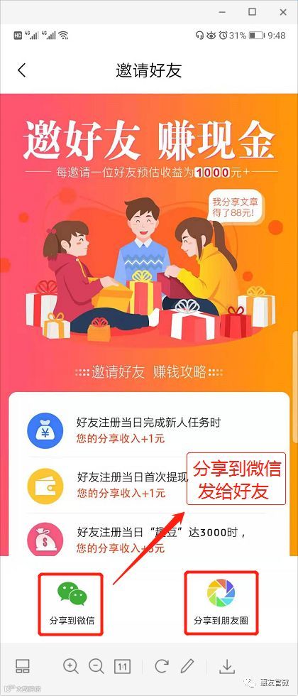 3.可以告诉您的朋友:注册可得红包,当天即可提现;