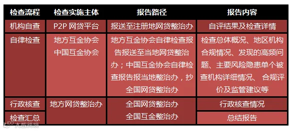 此次合规检查最后期限为2018年12月底,检查程序包括机构自查、自律检查、行政核查及检查汇总三项检查程序,开展各项检查的主体及检查结果报告路径不同,体现了由下至上、层层上报的关系,具体如下: