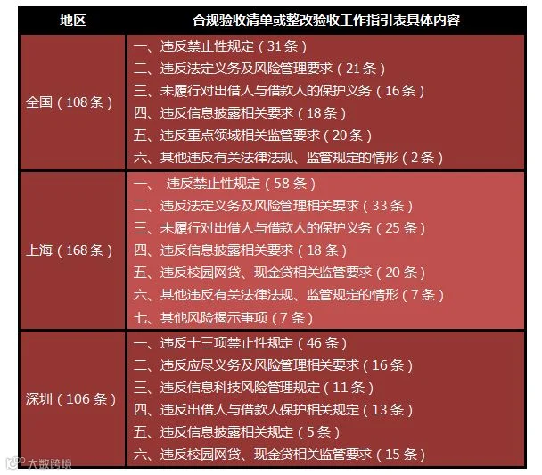 从全国、上海、深圳下发的合规验收清单或整改验收工作指引表组成部分来看,基本大同小异,主要是由网贷监管细则中的十三条红线、平台应尽义务及风险管理相关要求、信息披露、重点领域红线以及其他违反有关法律法规、监管规定的情形等部分组成。