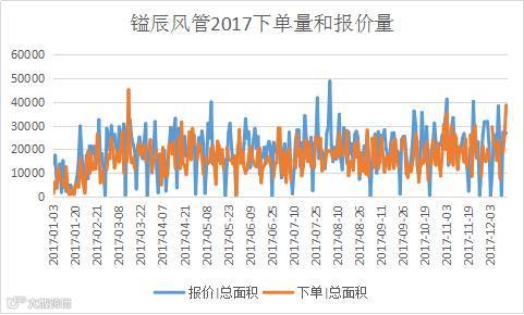 镒辰风管报价团队数据显示,2017年11月3日当日镒辰风管下单量、报价量创新高,分别达3.55万㎡和5.06万㎡,刚过一月,2017年12月13日,风管量再创新高,风管下单量达3.87万㎡!根据市场调查,市场上风管厂家月风管销量为5万㎡-10万㎡左右,而镒辰一日的风管销量相当于其他厂家大半个月的销量!