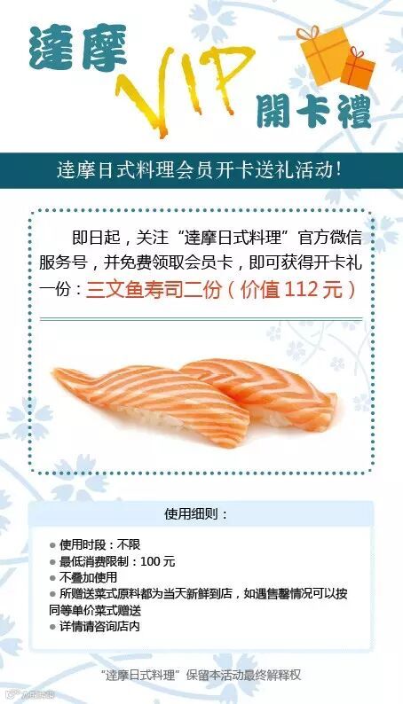 导读:现在申请成为“逹摩日式料理”VIP,即可获得我们送出的开卡礼一份哦!