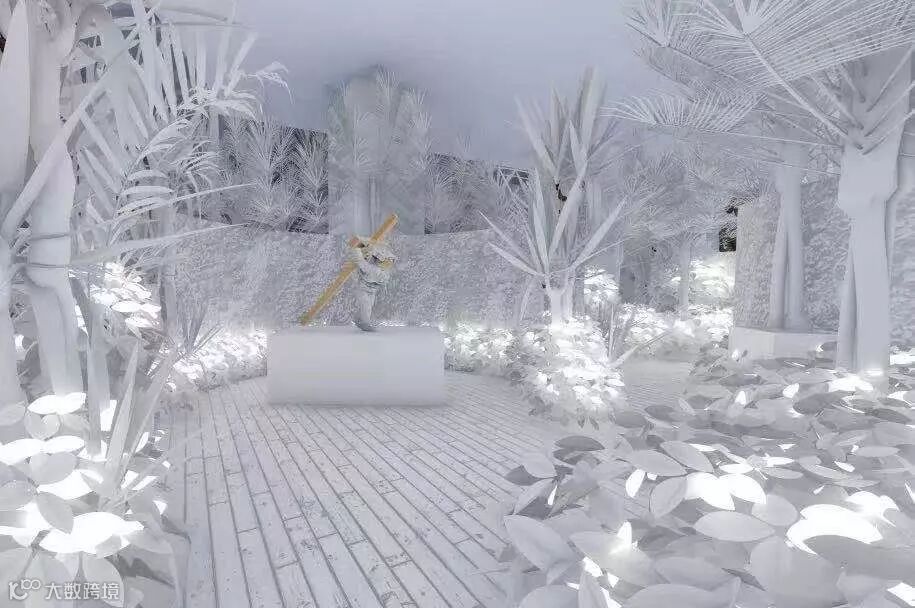 为了让观赏者沉浸在白之森“荒蛮”丛林中,空间内采用大量的热带植物,以棕榈科、蕨类植物为主,通过分布与排序,让失去色彩的“荒蛮”丛林保持生命力与神秘感的同时,与空间及作品完美融合为一体。
