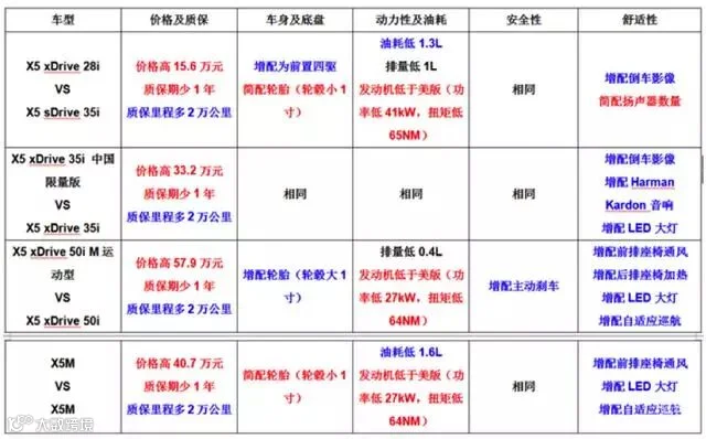 美版X5M型与中规版X5M型参数对比见下表: