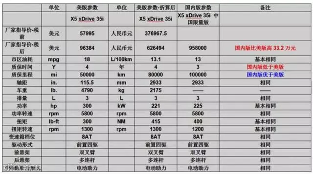 美版X5 xDrive 35i型与中规版X5 xDrive 35i 中国限量版参数对比见下表: