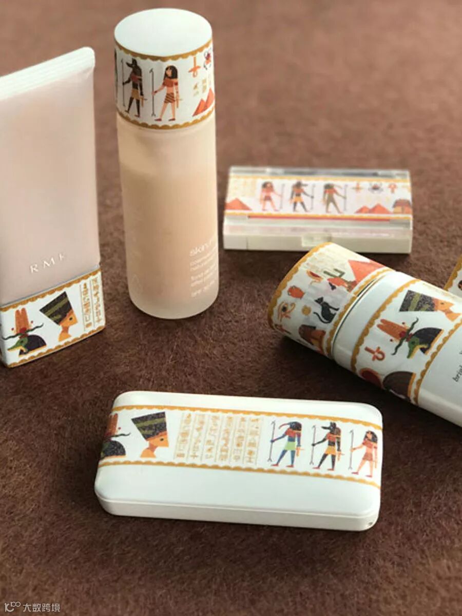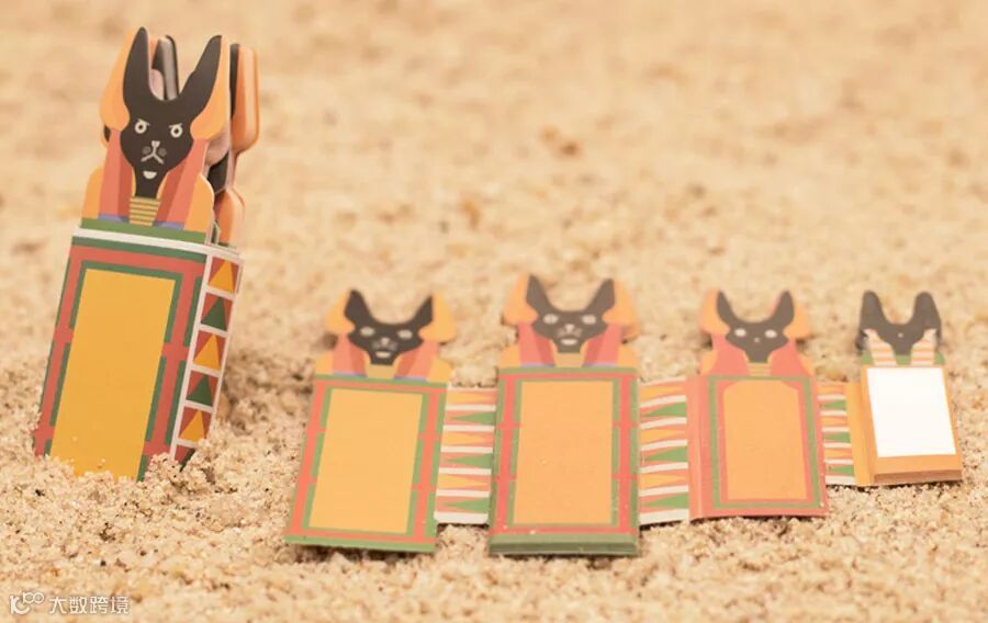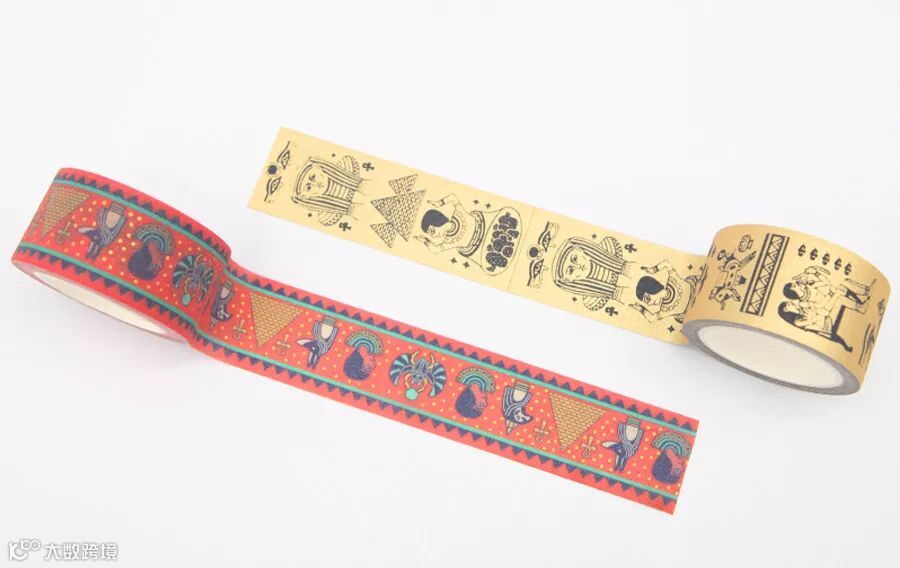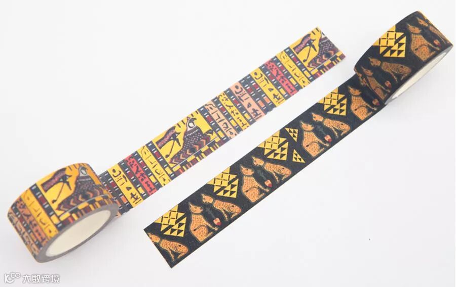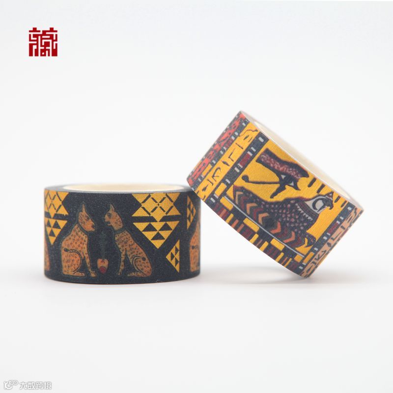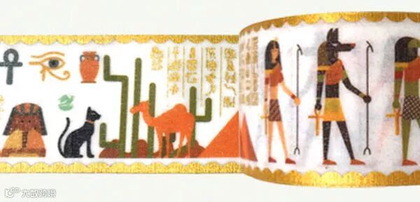 胶带以亡灵书中的文字、符号、人物、饰品和埃及代表性的风景(金字塔建筑、沙漠、骆驼、仙人掌等)作为基本元素;将元素以卡通形式再现后,有机排列组合,便是胶带的图案:埃及风情图。