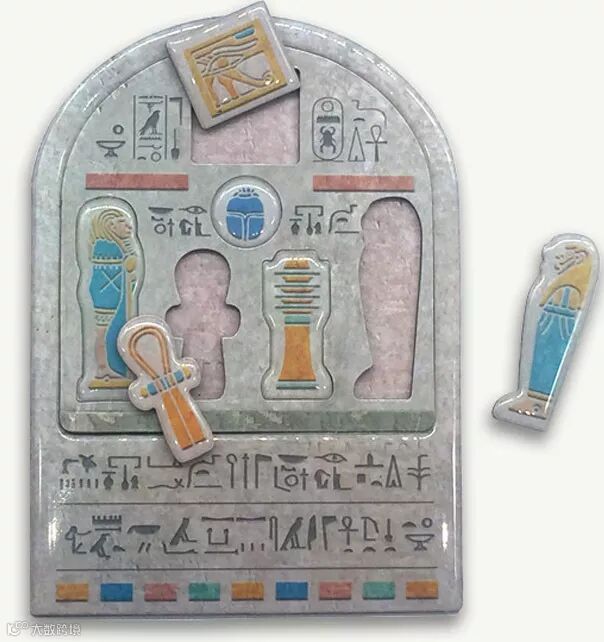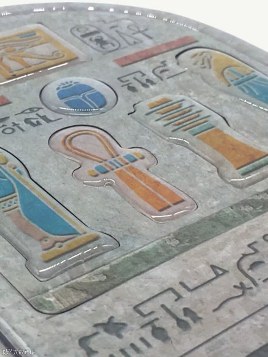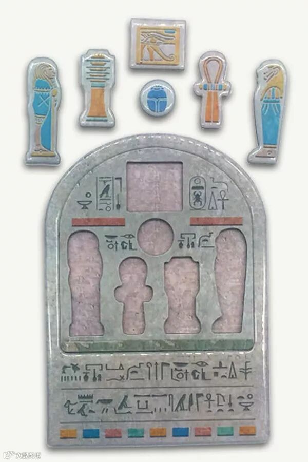 以迈吉蒙托墓碑为灵感,注入大胆的想象,采用埃及象形字等元素为以上图案绘制外边框,形成一块“守护石碑”冰箱贴。
