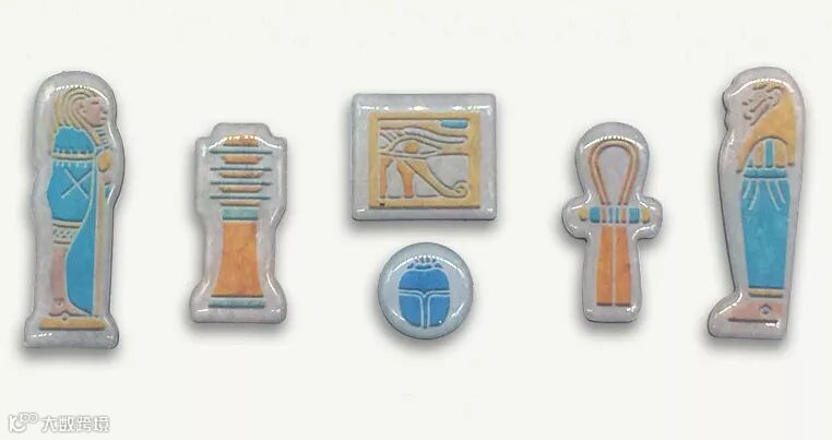 从乌杰特眼、心脏圣甲虫、荷鲁斯四子、安卡十字架、节德柱等埃及釉陶形象出发,加以复古配色重新绘画,制作成冰箱贴的零件。