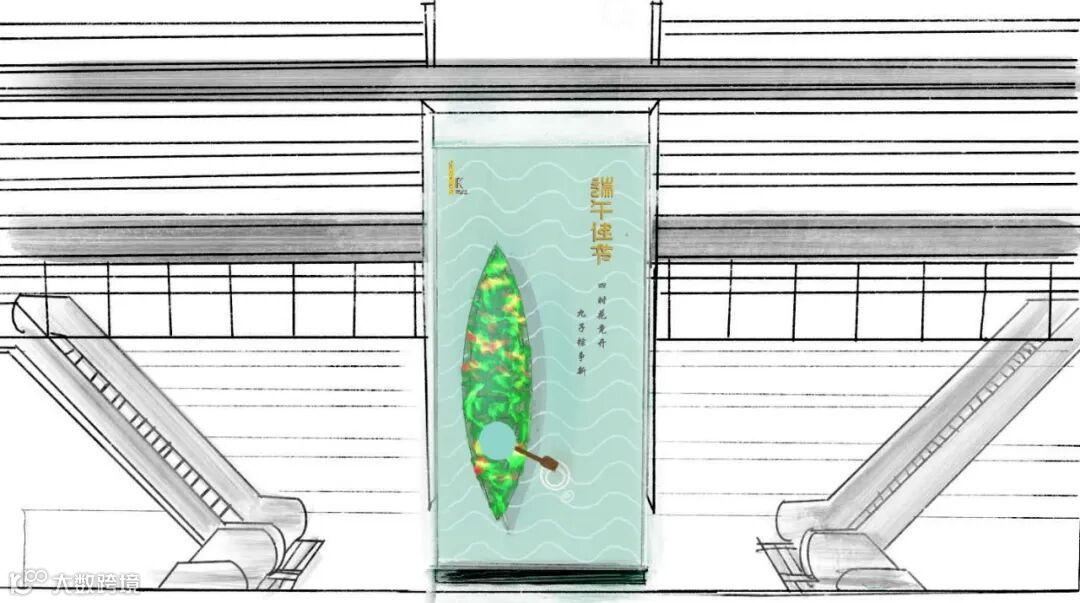 以三棱镜为原型,用金属材质和亚克力营造阳光折射出的彩虹光线,