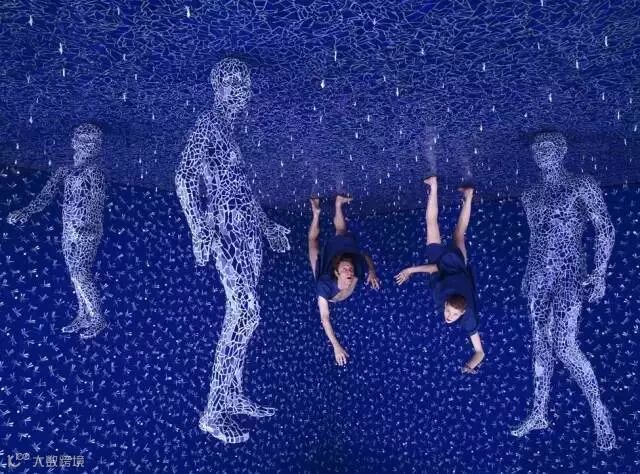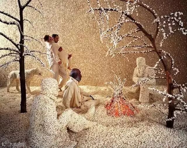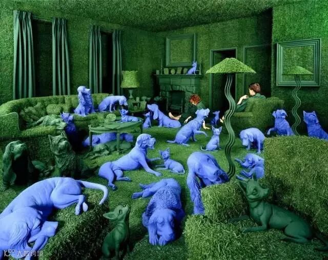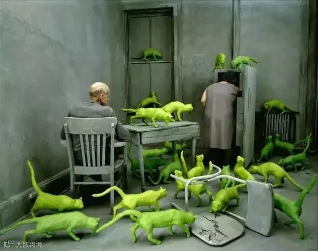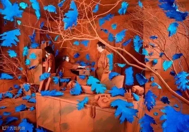 蓝灰色的屋子,独自玩耍的小孩,满屋的红色金鱼,寂静安宁甚至有些诡异。看到这幅图的时候,很多人都以为是后期PS的摄影作品,而让人惊奇的是,这只是女艺术家桑迪将自己精心准备的故事场景拍摄下来而已。