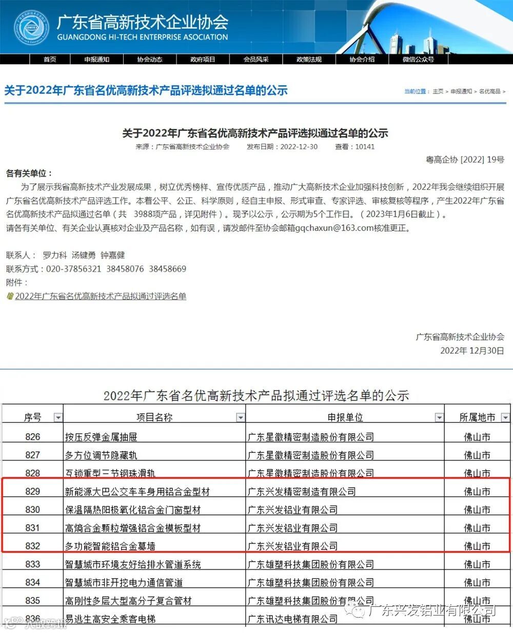 近日,广东省高新技术企业协会公示“2022年广东省名优高新技术产品拟通过名单”,其中,兴发铝业的“保温隔热阳极氧化铝合金门窗型材”、“高熵合金颗粒增强铝合金模板型材”、“多功能智能铝合金幕墙”和兴发铝业子公司兴发精密制造的“新能源大巴公交车车身用铝合金型材”共四项产品上榜,是对兴发技术创新和产品研发成果转化能力的充分认可和肯定!