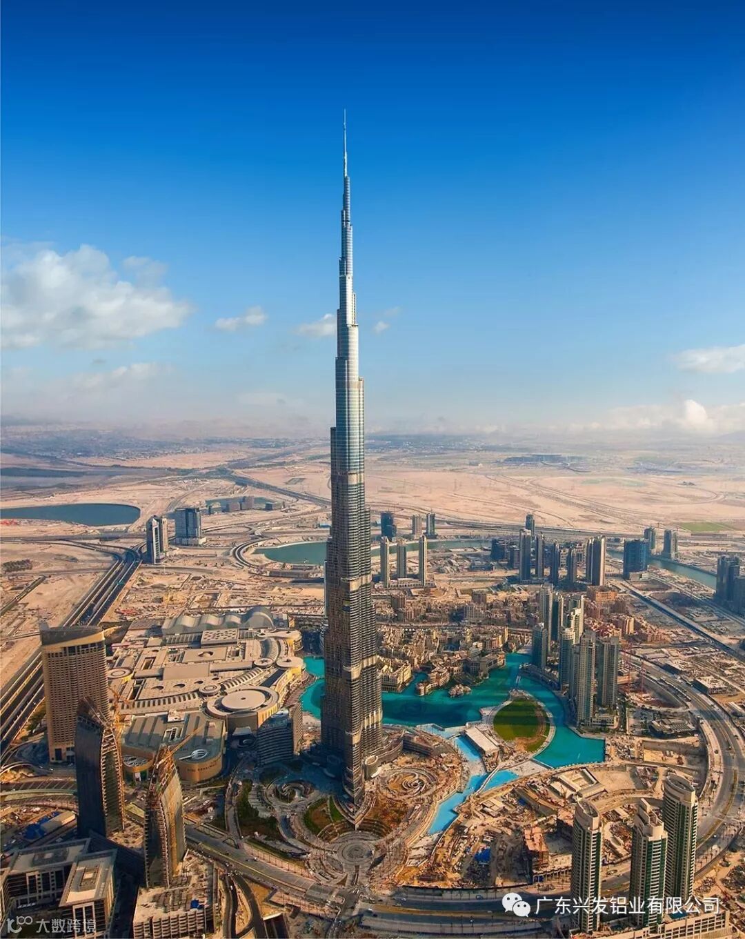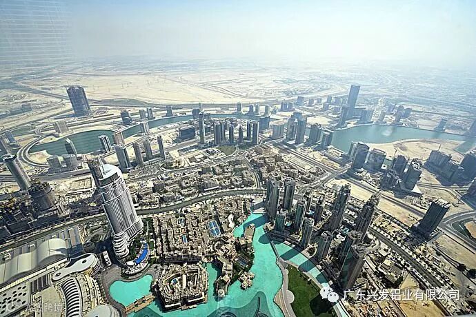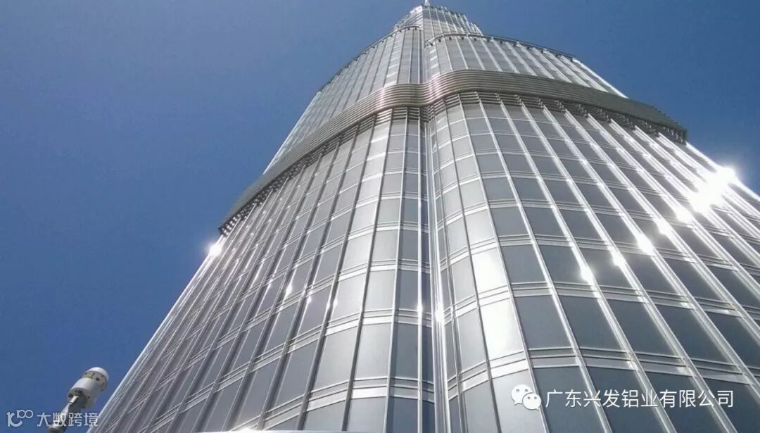 迪拜建成有总造价15亿美元,总高度达828米,162层楼高的世界第一高楼哈利法塔,原名迪拜塔,哈利法塔光彩外表幕墙大气雄浑,充分展示其世界第一高楼风采,哈利法塔的所有幕墙皆为中国制造,而其铝型材用料为中国广东兴发铝业提供。