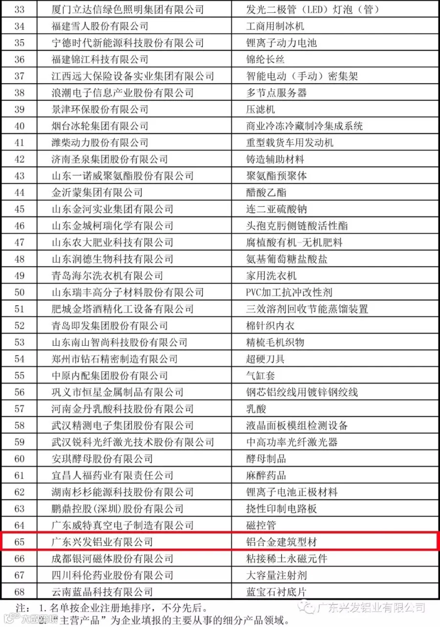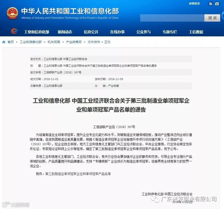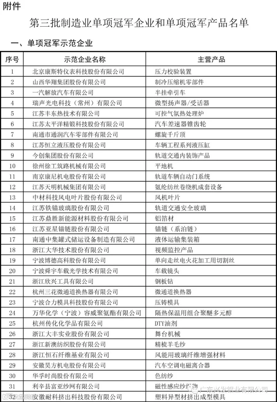为引导制造业企业专注创新和质量提升,在更多细分产品领域形成全球市场、技术等方面领先的单项冠军地位,提升我国制造业国际竞争力,促进我国产业整体迈向全球价值链中高端。近日,工业和信息化部、中国工业经济联合会联合下发《关于第三批制造业单项冠军企业和单项冠军产品名单的通告》,兴发铝业成功入选第三批制造业单项冠军示范企业名单。