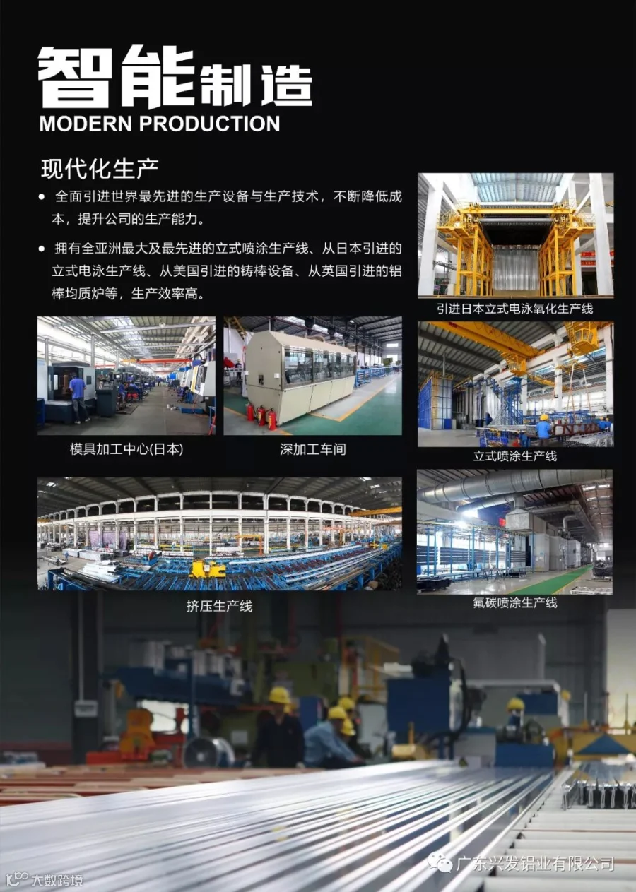 公司拥有完备的现代化生产线,大型进口专业制造设备,包括全亚洲最大及最先进的立式喷涂生产线、从日本引进的立式电泳生产线、从美国引进的铸棒设备、从英国引进的铝棒均质炉等,不断降低成本,提升公司的生产能力。并结合数字化品质控制软件系统,实行全程品质管理。