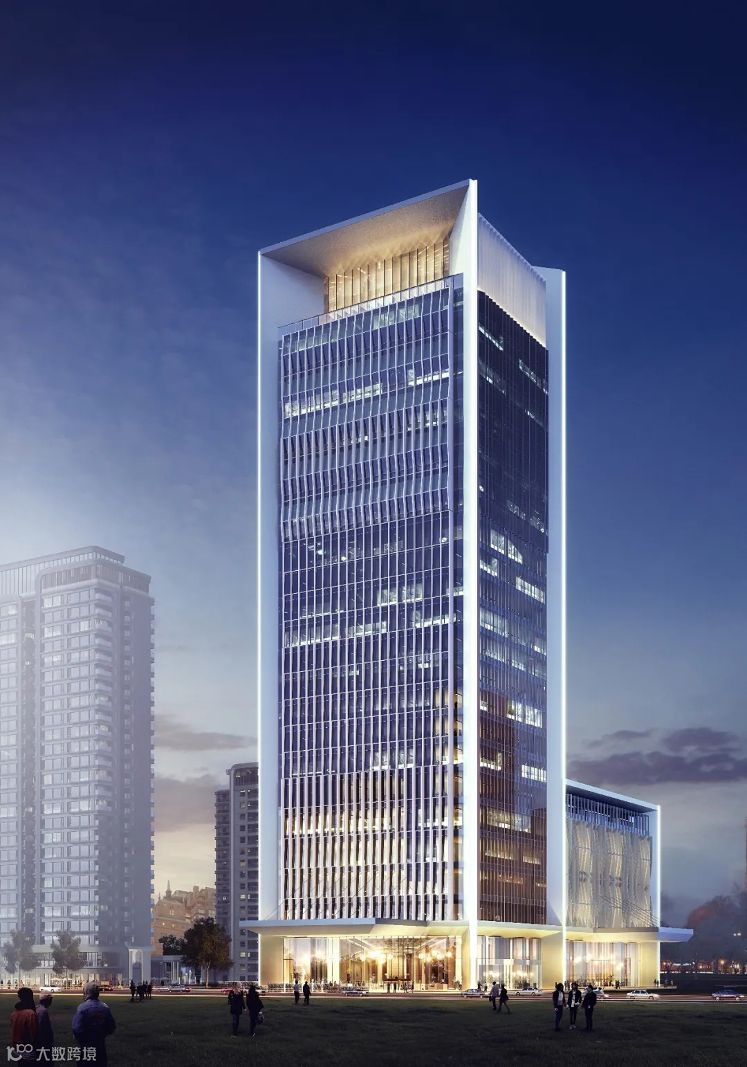 以“石材基座+大面积系统窗+铝板”为主打造建筑外立面,
