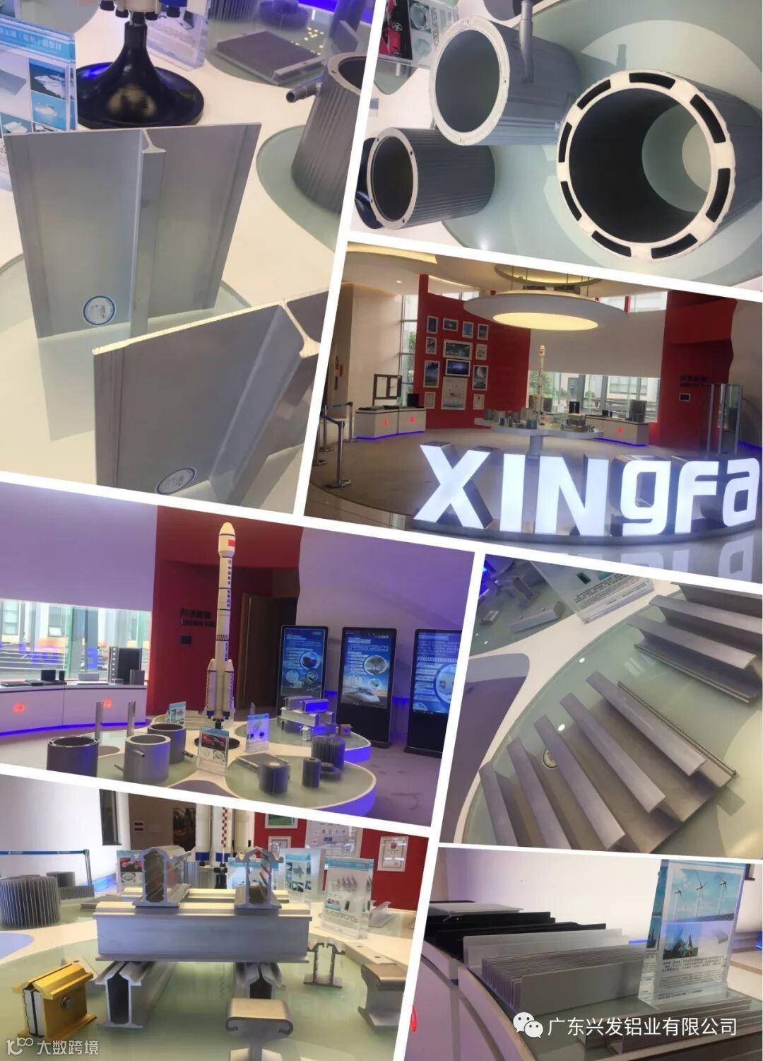 主要展示工业型材实样,在这里可以看到兴发的工业型材已经广泛应用于各个领域,包括:交通运输用铝型材、建筑工业铝型材、散热器铝型材、冷藏集装箱用铝型材、航空航天用铝型材,并配置了投影仪和触摸屏供播放工业型材的宣传片辅以说明介绍。