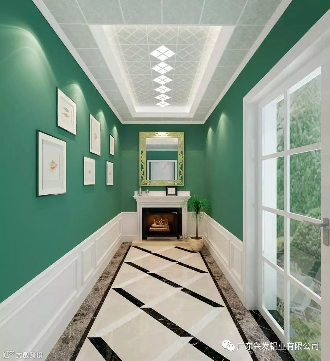 或彩绘玻璃天花板,或金属天花板等,