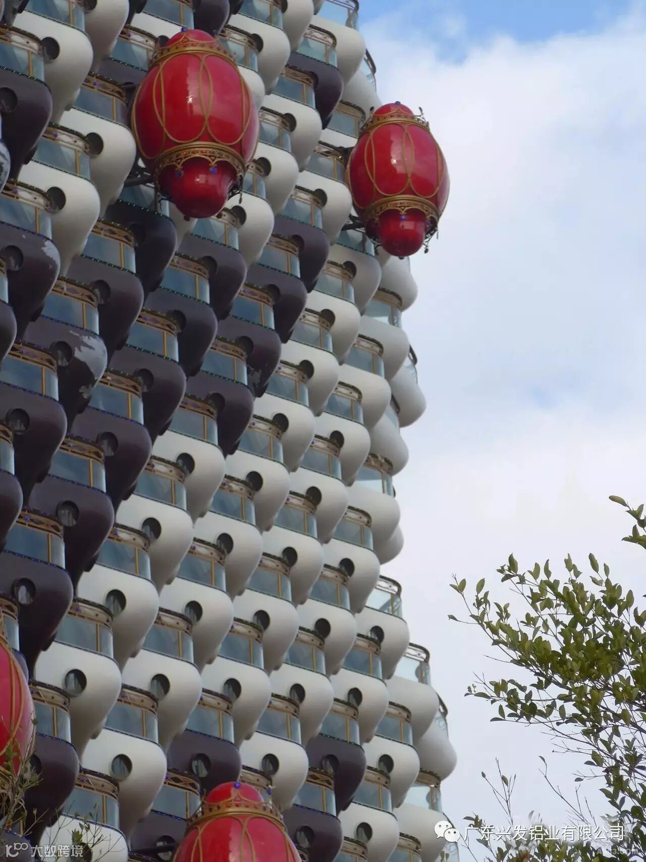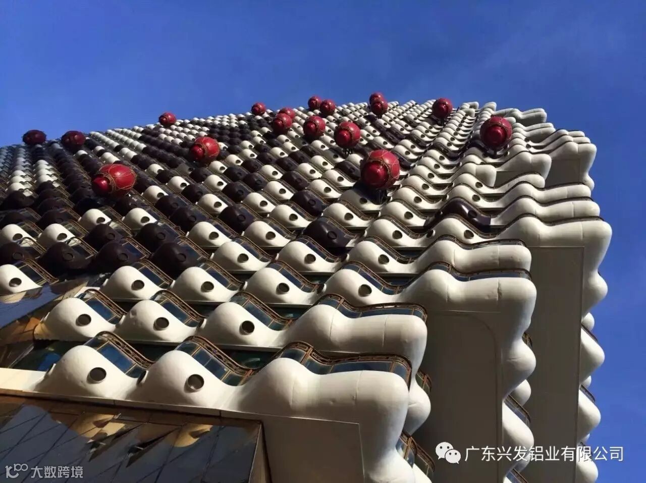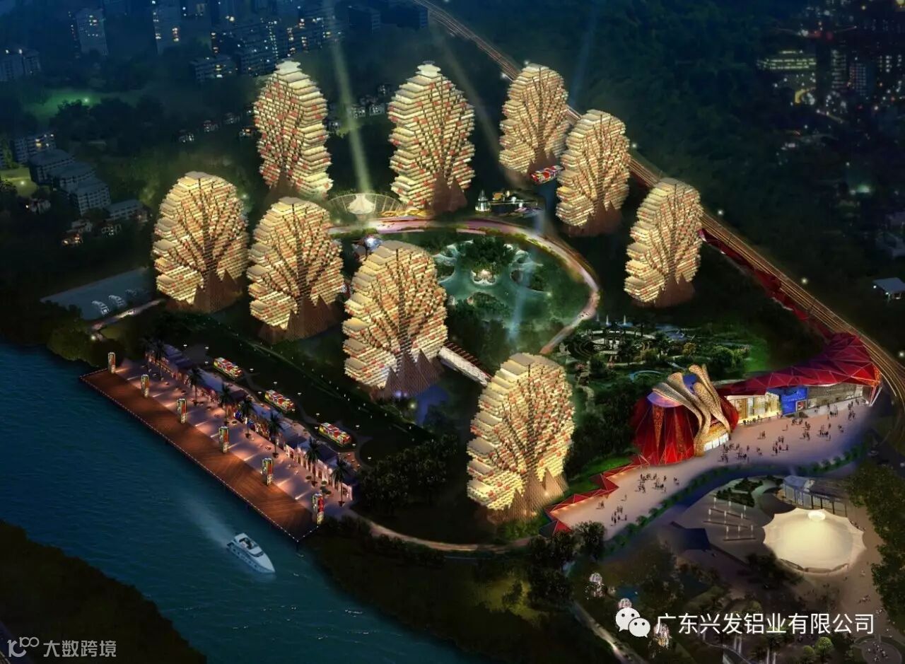 “美丽之冠”复杂的外立面结构,除玻璃幕墙和提升推拉门系统是常规的幕墙系统,其余的分别为双曲铝单板系统、栏杆系统、灯笼体系统等,无论是设计制作还是施工安装难度都非常高,其中双曲铝板的设计及加工最为困难。项目中所用到的配套建筑材料也都由国内一线品牌提供,其中使用的铝型材由兴发铝业供货。