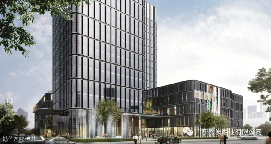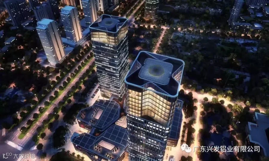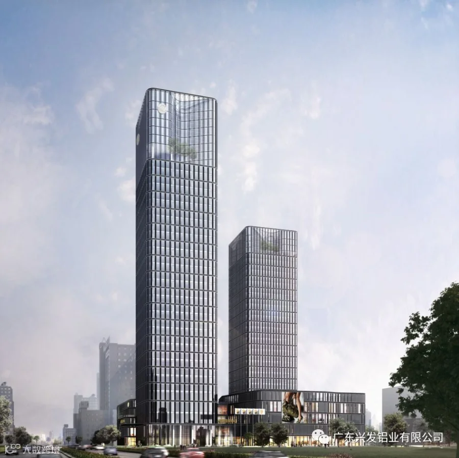 两栋地标式塔楼交错布置,其塔楼特色为凸凹双楼层大板块单元系统,塔顶为大跨度双层框架式索支承系统,幕墙系统形式繁多,包括单元式玻璃幕墙系统、塔楼顶部双层框架式索支承玻璃幕墙、铝合金框架式玻璃幕墙系统、钢铝合金框架式玻璃幕墙系统、采光天窗玻璃幕墙、开放式石材幕墙系统、开放式不锈钢板幕墙系统等,幕墙面积高达8.3万平方米,幕墙造价为1.23亿元。建筑外立面均以玻璃幕墙为主,整体建筑具有很强的现代感,工程所使用的配套材料中铝型材由兴发铝业提供。整体建筑外观既稳重大方又不失新颖,充满时代气息,既突出了现代和科技绿色环保的概念,同时也充分体现了高文化品质和追求。