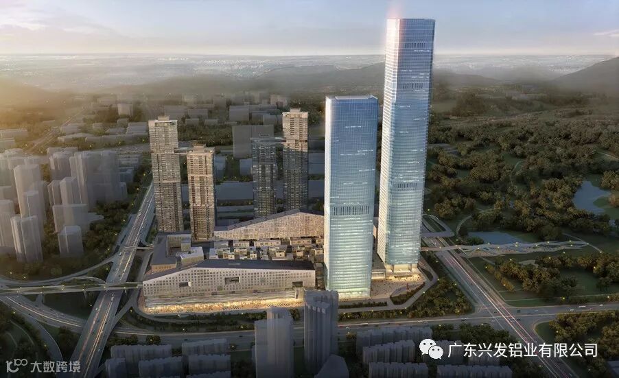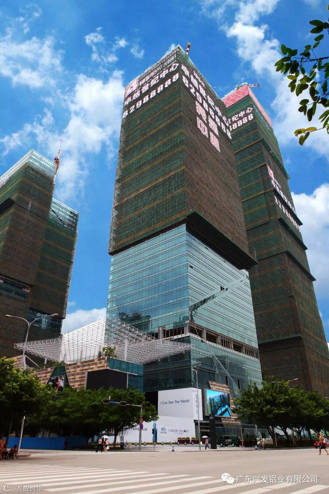 深圳京基100大厦位于深圳CBD核心区深南东路,总高度约441.8米,共100层,建筑外形流畅,宛如“飞流直下三千尺,疑是银河落九天”的瀑布。京基100大厦是集超甲级写字楼、铂金五星级酒店、国际时尚精品购物中心、高级公寓、住宅于一体的世界级城市综合体,总建筑面积602401.75 平方米。为了保证大楼的环保节能,楼体的8.5万平方米玻璃幕墙,全部采用经过环保处理之后的国产产品,使用的铝型材由兴发铝业提供。