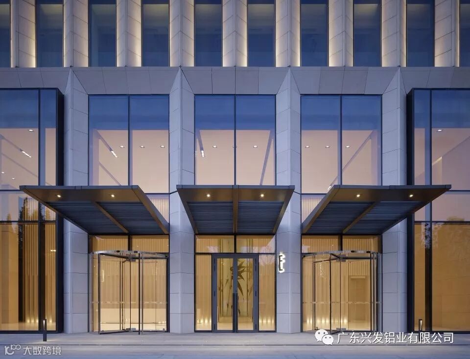 建筑正面入口大尺度玻璃幕墙近乎透明,薄片叠加条带状立面肌理,修长窗带贯穿建筑体始终,与封闭的窗扇以及顶部的退进设计营造出远观如轻盈薄片层层叠加的效果, 立面丰富多变适应并配合了周边城市环境中存在的多元化尺度。建筑使用兴发铝材氟碳料。