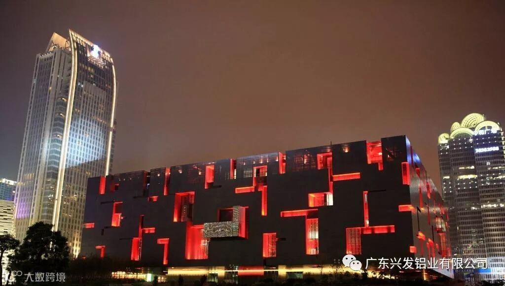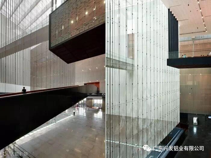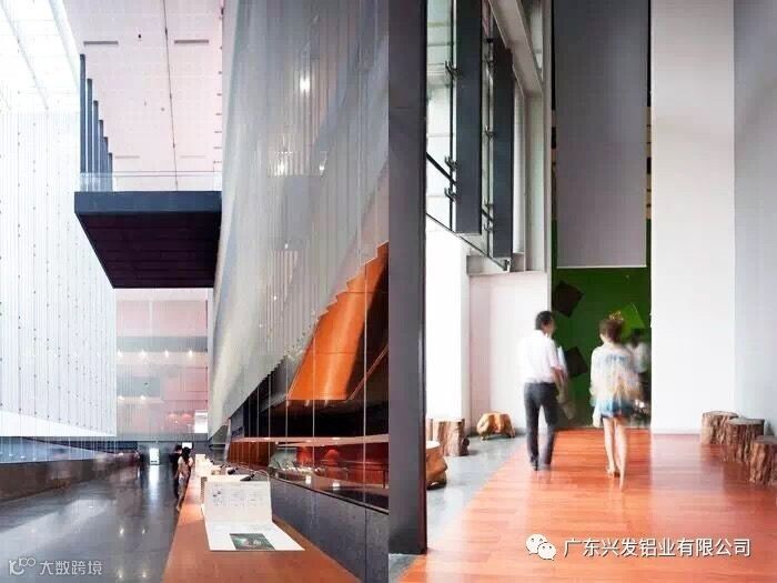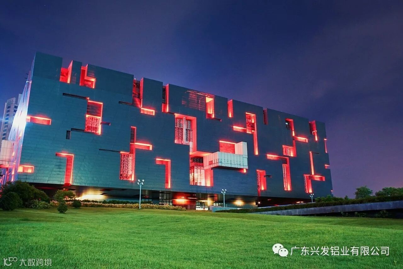 运用铝板、玻璃、花岗石,塑造出现代几何色彩的立体方正设计;一扇扇不同图案的窗户,展现出一份独特而趣味无穷的特质。铝型材由兴发铝业提供。为了延续“宝盒”的透雕构思,走廊也通过打孔金属板和中庭空间隔断,若隐若现之中层次感得到了加强。大面积的绿地草坡沿博物馆向西逐渐减缓形成清晰的主入口广场,并与中央林荫大道融为一体。