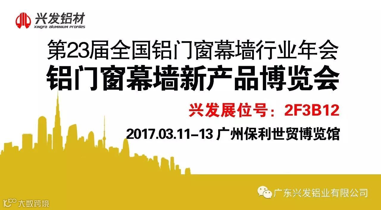 兴发铝业将参展2017年03月11日--13日在广州保利世贸博览馆举办的“第23届全国铝门窗幕墙行业年会暨铝门窗幕墙新产品博览会”,诚邀您届时来我司展位参观指导。展位号:二层3号馆3B12,参展面积:304M2.,期待您的拨冗光临!