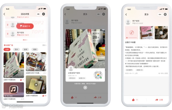 打卡系统作为“阅读社交平台”,促进读者互动(如阅读笔记点赞、组队挑战),增强读者与图书馆之间的链接。