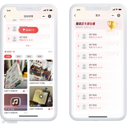 打卡奖励设置,连续打卡可解锁虚拟勋章、积分兑换礼品,增强成就感。排行榜竞争,个人/组队排名刺激读者持续参与,满足社交与竞争需求。