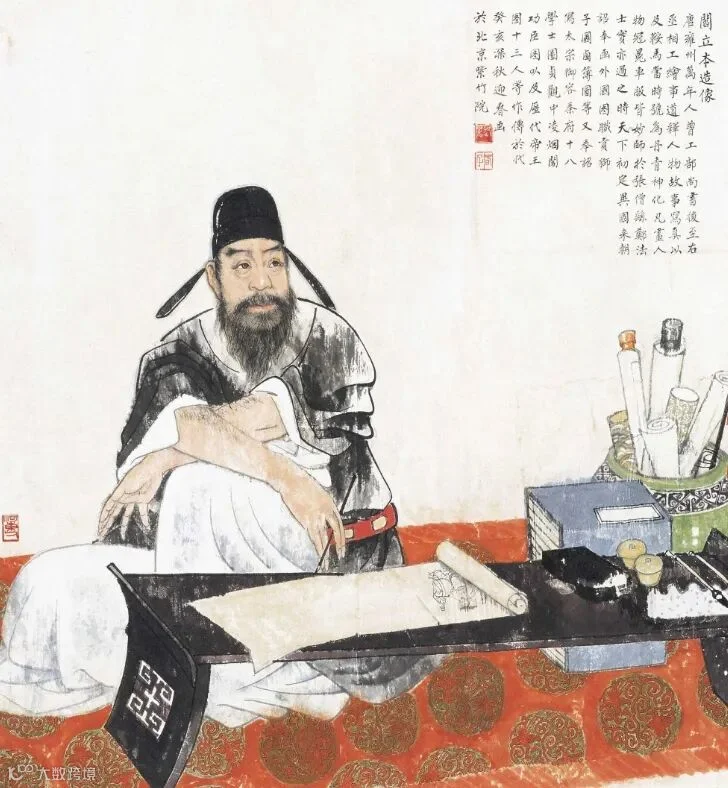 阎立本(601~673年),唐代雍州万年人,隋代画家阎毗之子,阎立德之弟。唐太宗时任刑部侍郎,显庆初年,代兄做工部尚书,总章元年为右丞相。擅长书画,最精形似,作画所取题材相当广泛,如宗教人物、车马、山水,尤其善画人物肖像。