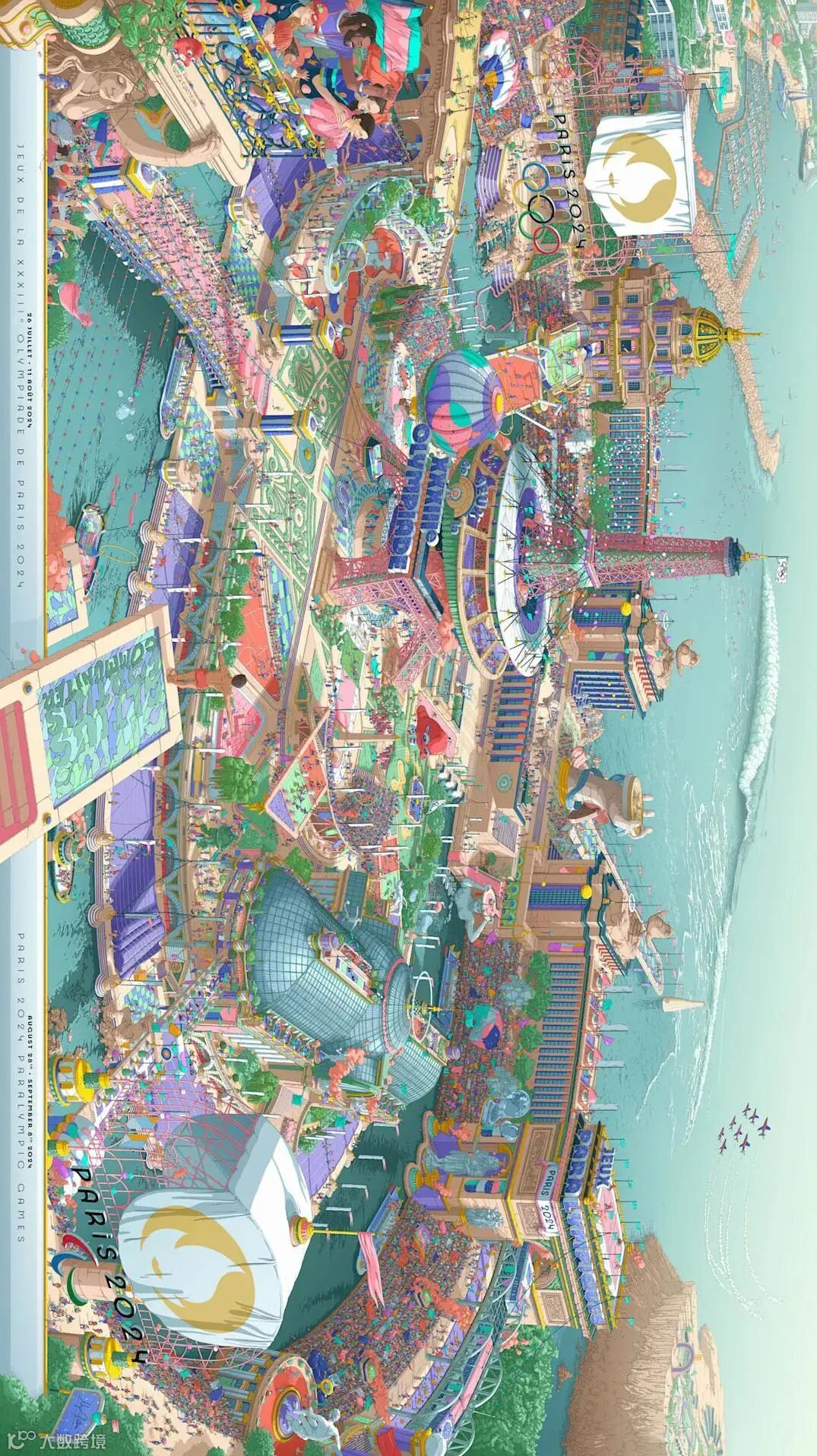 巴黎是一座时光酝酿的千面之城,古老又现代、浪漫又文艺,以其独特的浪漫氛围和丰富的文化活动而闻名,本届奥运会海报也看点颇多,描绘了一个多元且繁华的微观世界——一座巨大的城市体育场,无数巴黎元素被有趣呈现出来。