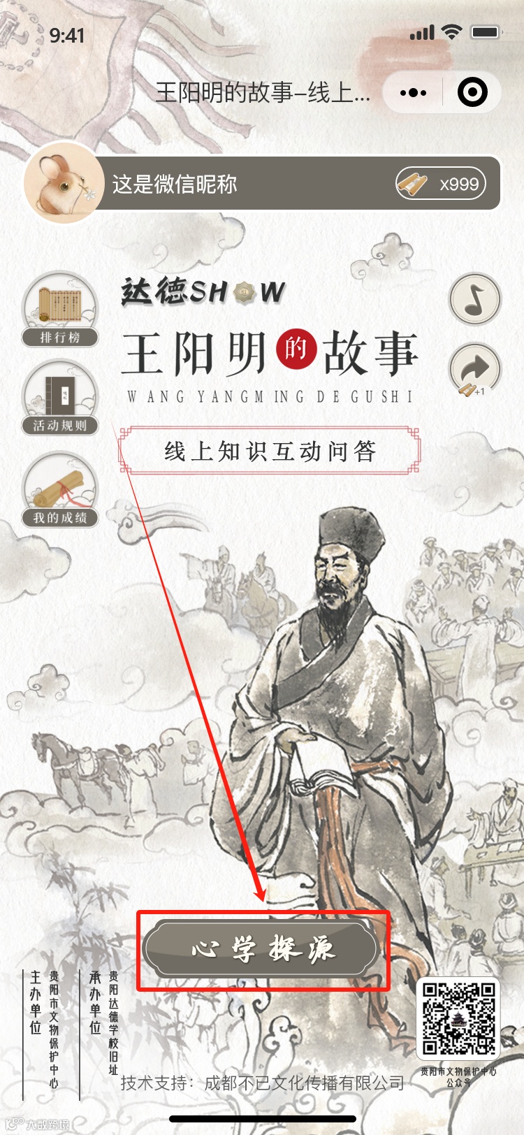 《王阳明的故事》是由贵州省美术家协会名誉主席、贵州画院名誉院长陈石用七十余幅画作描绘了王阳明波澜壮阔的一生,著名“剧本杀”作家梁希吾则用逻辑严密、环环相扣的文字故事,让这位明代大儒、心学集大成者更显传奇。此次阅读活动以互动问答的方式让我们走近王阳明,了解王阳明,感受阳明文化。市民朋友可关注“贵阳市文物保护中心”公众号,点击公众号内活动链接或扫描下方活动二维码进入主页面,参与互动问答,答题积分排名前50名的朋友,我们将送上一份新年心意。