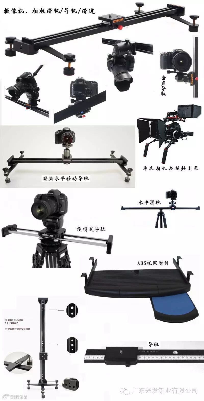 摄影用铝型材一般有导轨铝型材和支架铝型材等,这些都是铝棒通过热熔,挤压从而得到不同截面形状的铝材料,因添加的合金的比例不同,生产出来的工业铝型材的机械性能和应用领域也不同。